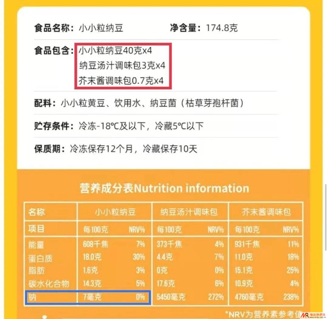▲图:某品牌纳豆配料和营养成分dJ8每日快评网